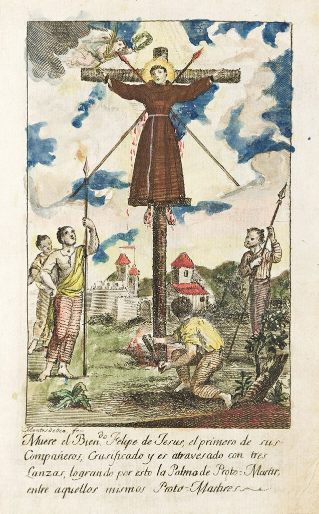 Il 5 febbraio 1597, sulla collina di Nishizaka, alle porte di Nagasaki, furono erette ventisei croci. I martiri furono fissati alle croci mediante anelli di ferro al collo, alle mani e ai piedi. La croce di Felipe era la tredicesima, quella centrale, come a volergli conferire un posto d’onore tra i martiri.